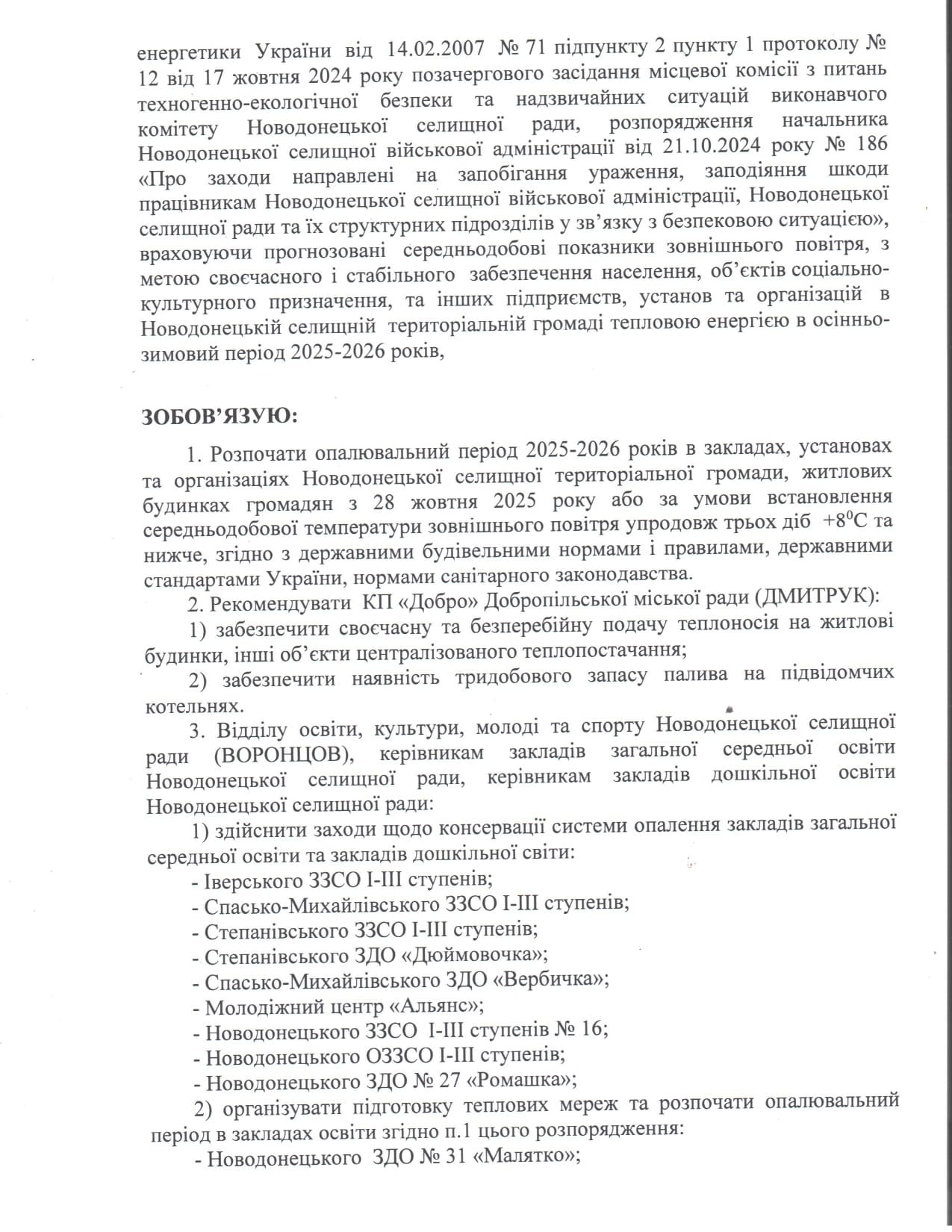 Розпорядження про початок опалювального періоду 2025–2026 років на території Новодонецької селищної територіальної громади